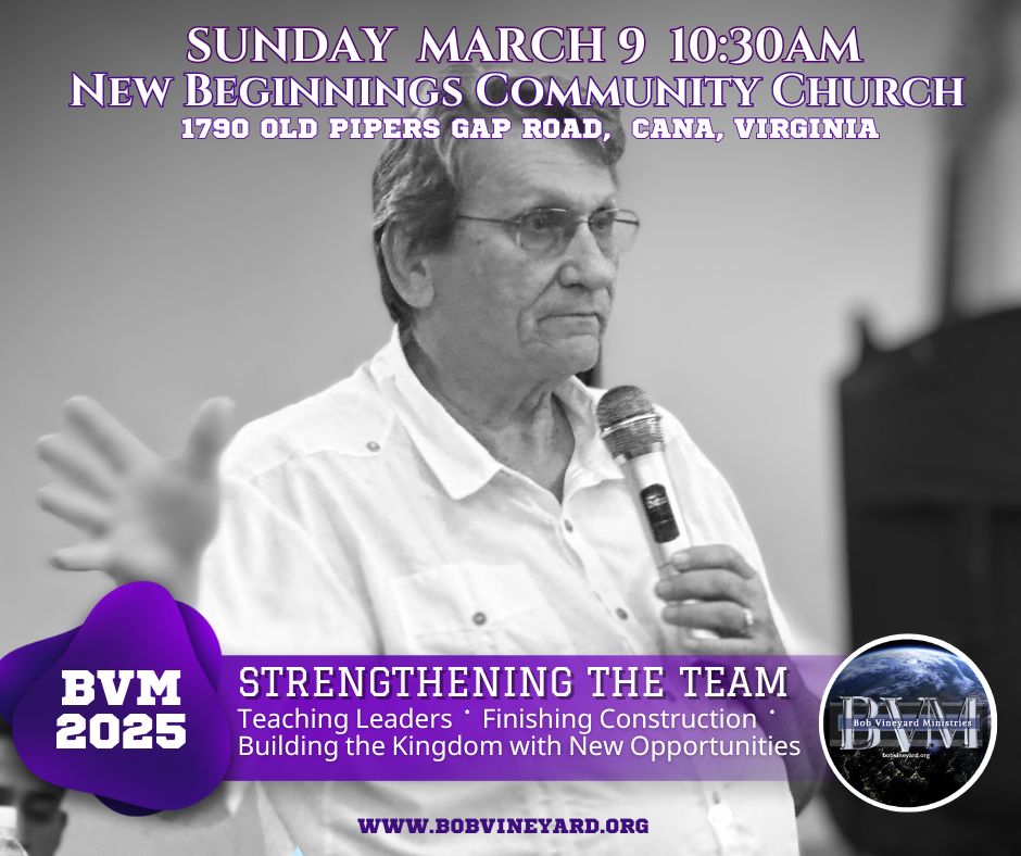 Dr. Bob will be in Cana, Virginia, at New Beginnings Community Church on Sunday morning March 9th @ 9:30am. He will inspire you with a new vision for BVM, Strengthening the Team. Please join us.